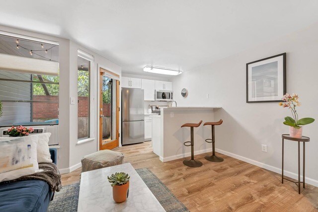 Profitez de la facilité et de la tranquillité d'esprit de votre propre cour et entrée privées. Notre concept à aire ouverte offre une sensation d'espace, avec des espaces pour manger, dormir et passer du temps. La porte à digicode permet une arrivée autonome dans un environnement sûr, privé et propre. Évier et grand comptoir pour préparer votre café du matin ou préparer un repas simple. Salle de bain principale attenante avec une grande douche à l'italienne. Parking aisé devant la maison. Internet haut débit par fibre optique.