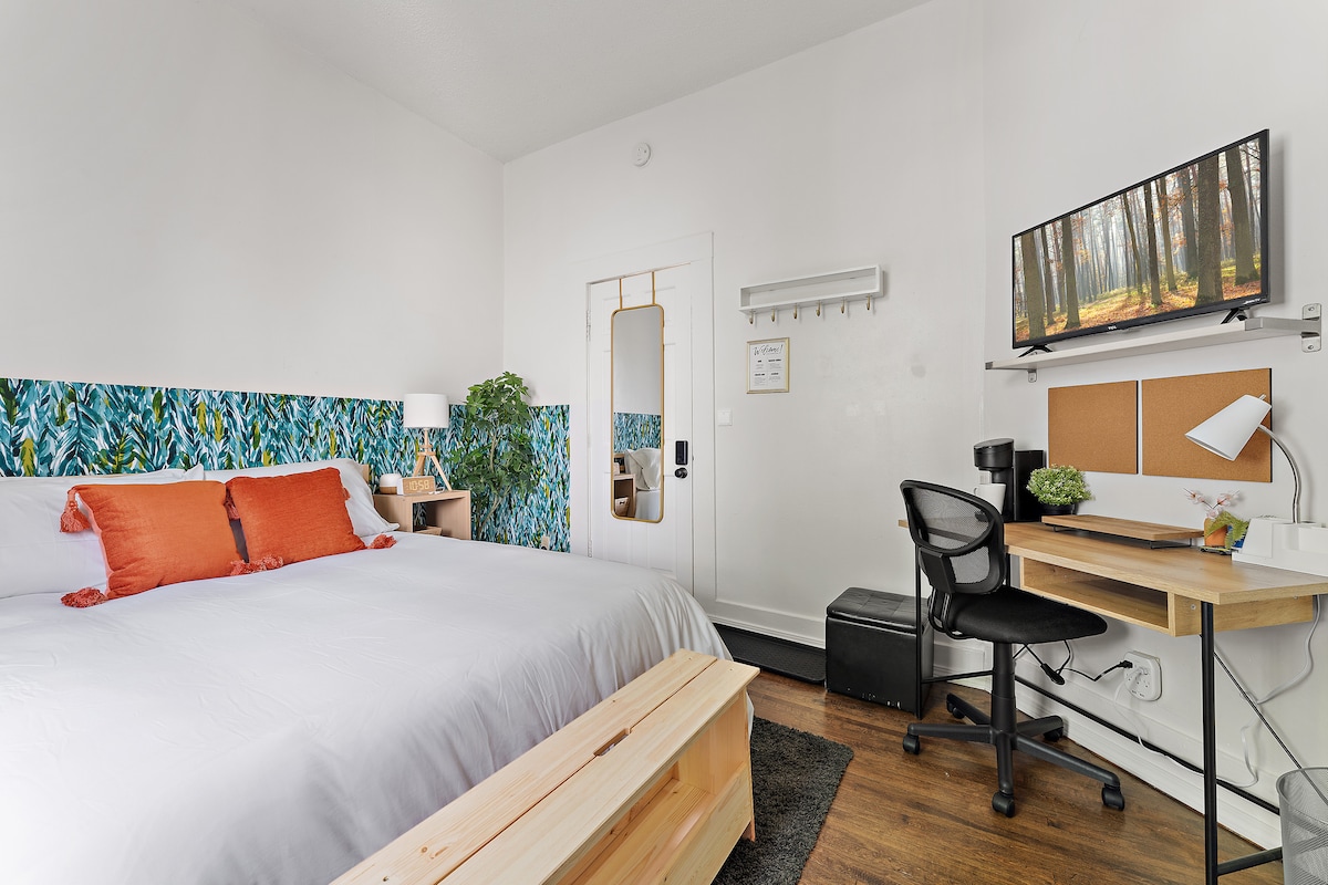 Bienvenue dans notre charmant studio au 3e étage situé dans une maison victorienne au cœur du quartier des arts du nord-est ! Cette retraite confortable bénéficie d'une abondance de lumière naturelle à travers les puits de lumière, illuminant un espace orné de belles plantes, créant une ambiance sereine et accueillante. Ce charmant havre de paix dispose d'une cheminée chaude parfaite pour se détendre lors de soirées fraîches. Veuillez noter qu'il y a un faible dégagement près de la tête du lit et dans la salle de bain/cuisine.