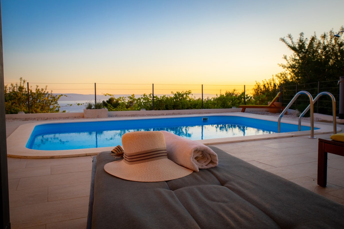 Charmante villa avec piscine privée chauffée de 24 m2 à Podgora, Makarska Riviera, avec vue panoramique sur la mer Adriatique et les montagnes environnantes. La plage la plus proche aux eaux cristallines se trouve à 2 km, ou à 3 min en voiture. Le centre de la station balnéaire de Podgora et d'autres commodités telles que des restaurants, un supermarché, une ambulance, un port, des transports et la vie nocturne sont à 2 km. C'est l'endroit idéal pour faire du vélo, de la randonnée, de la nature et des promenades en montagne, il est situé à proximité de la zone protégée du parc naturel de Biokovo.
