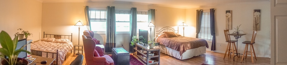 Unique et luxueux !! Appartement d'hôtes sur mesure, équipements impressionnants ! Espace incroyable avec de hauts plafonds partout, salle de bain principale avec douche à vapeur, 2e chambre/bureau, laveuse et sécheuse et balcon ! TOUT pour votre plaisir personnel et tranquille ! Idéal pour les voyages d'affaires ! Indépendant de la maison principale. Parking privé. ☀️ Ensoleillé avec un cadre magnifique, mais si bien situé ! Aéroport de Dulles. NOMBREUSES mises à jour et améliorations récentes apportées pour assurer un séjour agréable à nos voyageurs.