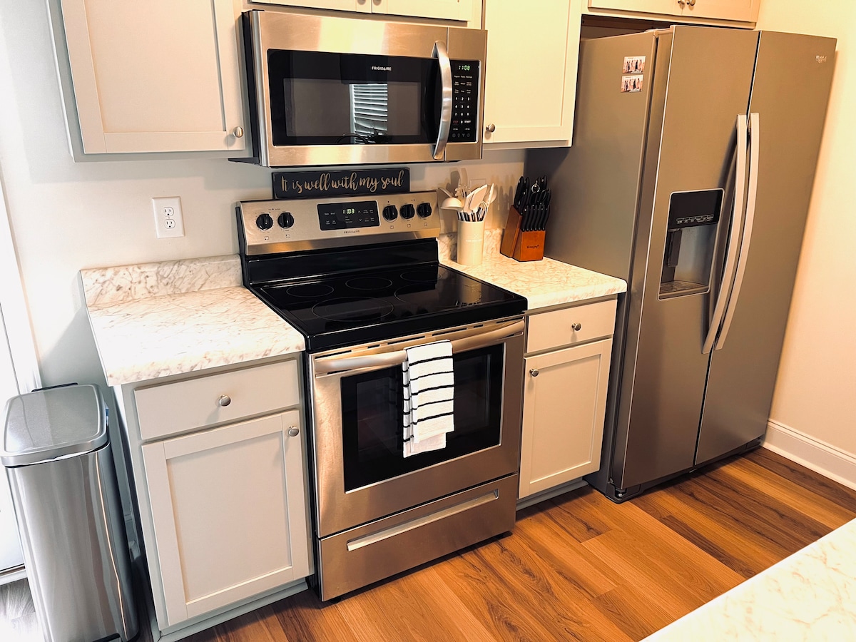Des équipements propres et simples font de cet emplacement pratique l'endroit idéal pour les voyageurs et les professionnels. Ce duplex propre et confortable de 2 chambres et 1,5 salle de bain est équipé de lits king et queen, d'une cuisine entièrement équipée, d'une télévision connectée de 55", d'une connexion Internet haut débit et d'un lave-linge et d'un sèche-linge grand format : quelque chose que vous ne trouvez pas partout. Il est situé dans un quartier calme, à proximité immédiate des attractions locales, des sièges sociaux de l'industrie et d'un aéroport international.