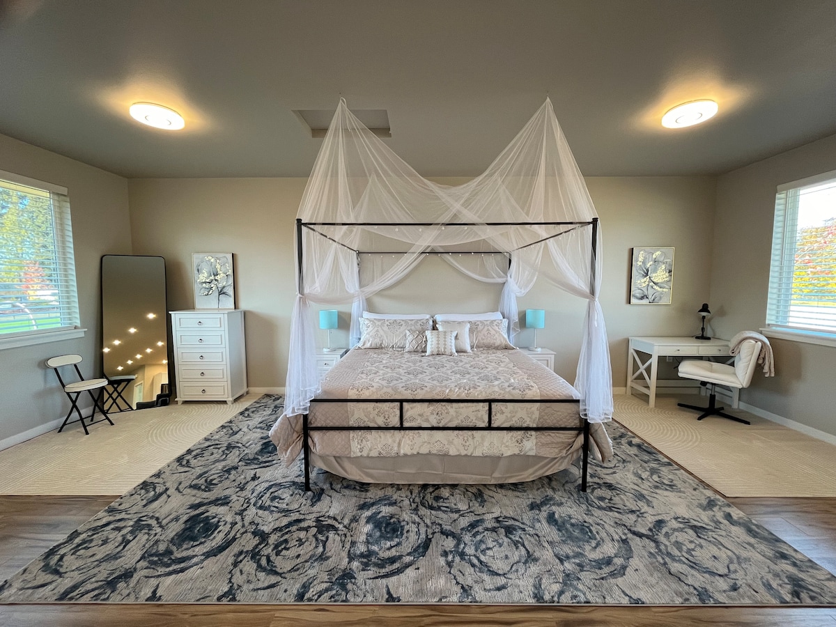 Le Studio est une maison d'hôtes très privée créée à partir d'un ancien studio d'art, élégamment meublée avec une touche champêtre. Situé dans une zone agricole, c'est un endroit idéal pour une escapade - pratique pour les fermes de lavande, les plages et les montagnes, mais à moins de 10 minutes du centre-ville de Sequim. La propriété dispose d'une entrée privée fermée, d'une vue sur la montagne, d'une cour clôturée et aménagée, et d'un grand parking. Une rangée de cyprès offre de l'ombre l'après-midi, et il y a une cheminée pour se réchauffer les soirées fraîches.