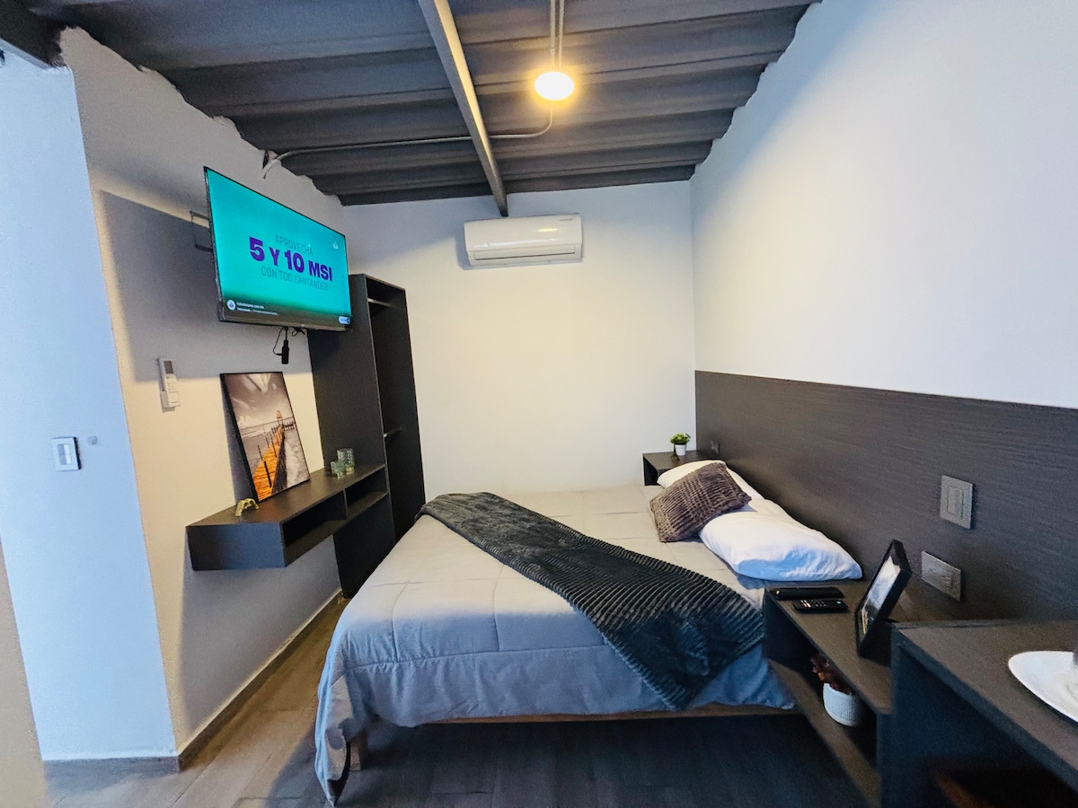 Relájate en una escapada única y tranquila en este Mini Loft Urbano y Acogedor, ideal para descanso o trabajo. Cuenta con cama Queen, aire acondicionado, WiFi, Smart TV de 50”, cocina equipada (parrilla, microondas y frigobar) y baño moderno. Espacio limpio, funcional y tranquilo. Acceso independiente con caja de seguridad para un check-in fácil y seguro.