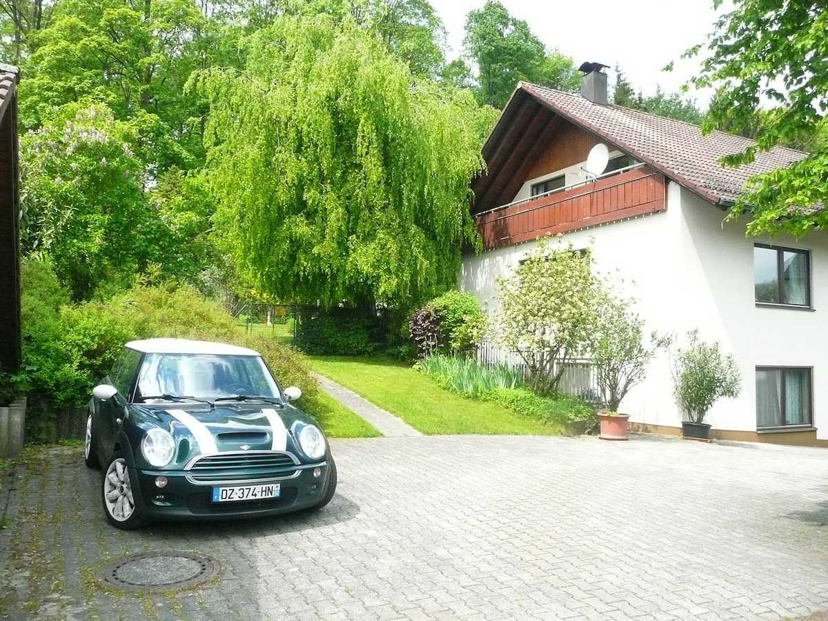 Un appartement calme au rez-de-chaussée dans une grande maison individuelle avec entrée séparée et parking privé. Grand studio avec lit double, canapé, fauteuils, télévision, Wi-Fi, sélection de DVD et de livres ainsi qu'une petite table de travail. Cuisine et salle de bain séparées. Une chaise haute et un lit bébé sont disponibles sur demande. Un restaurant italien, une boulangerie, une pharmacie et un supermarché sont accessibles à pied. Un vélo pour homme est à disposition à la location. Service de bus local vers Biberach (ligne 2)