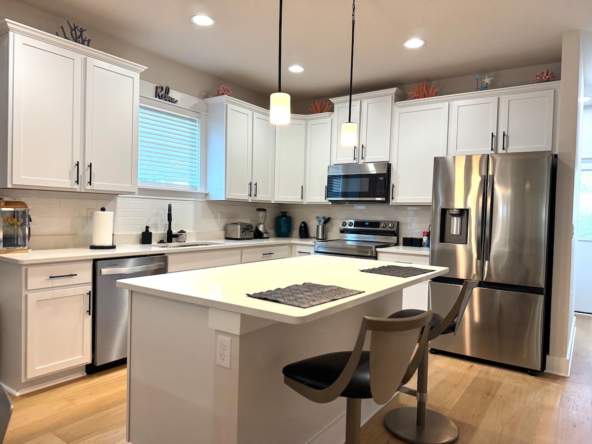 Amusez-vous avec toute la famille dans cette maison chic récemment rénovée. Tout est moderne et NEUF ! Profitez d'une agréable soirée confortable dans l'arrière-cour à côté du feu. Nous avons un lit King Size dans la chambre principale, y compris une salle de bain privée COMPLÈTE avec une douche en verre. La 2e chambre dispose d'un lit Queen Size à côté de la 2e chambre qui dispose d'une baignoire de jardin. Le canapé du séjour se déplie et fait un lit Queen Size. Chaque chambre est équipée d'une télévision connectée avec toutes vos émissions préférées.