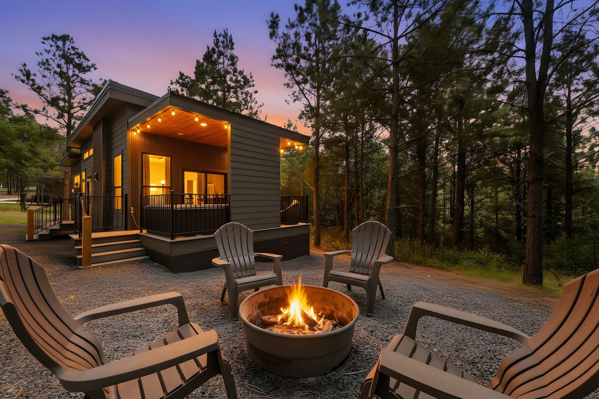 Blossom is a 2-story, 1-bedroom tiny cabin. It's the best of both worlds as well. Nestled in the back of our Tiny Town community, it backs up to the forest where you can enjoy the view on the covered deck. It's close to many of the area attractions. The cabin provides a queen bedroom downstairs and a short loft that houses a queen mattress. There are smart TVs, charcoal grill, firepit, and picnic table. Pet friendly: additional $20 fee (max 2 pets) NEW WIFI JUST INSTALLED!!!