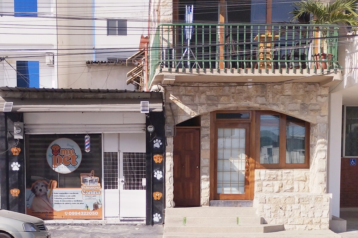 Suite très confortable (2 étages) dans le centre ville de Salinas (2e rue). Zone très sûre, entrée avec double porte. Entièrement équipé, avec climatisation dans la chambre (divisée) et salle de bain, salle de bain séparée pour les voyageurs. Wifi, cuisine avec tous les appareils. Joli patio vert avec de belles vues. Cette suite est située à côté de l'Hotel Salinas Beach et de l'autre côté de la rue de l'hôtel Marvento ll. Plage et Malecón, supermarché, pharmacies, bars et restaurants , bus pour toutes les directions accessibles à pied.