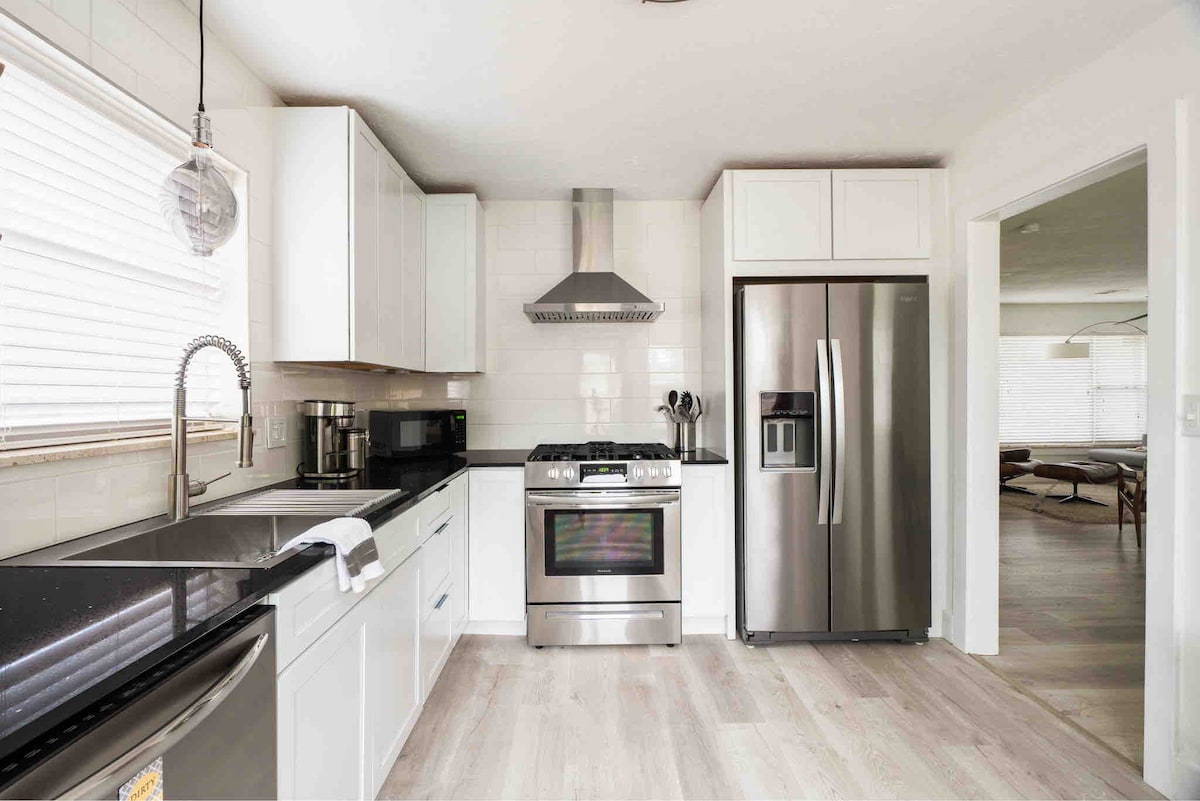 Lakeside Modern est une maison lumineuse magnifiquement rénovée et organisée - le point de départ idéal pour explorer tout OKC ! Vous trouverez tout ce dont vous avez besoin et plus encore pour un séjour merveilleusement relaxant et confortable avec tout le confort d'un chez-soi ! Lits de luxe avec rideaux occultants Cuisine entièrement équipée Cour arrière privée clôturée avec foyer et barbecue Espace de bureau avec WiFi rapide Salles de bain avec tout le nécessaire Lave-linge et sèche-linge Stationnement en garage et abri anti-tempête Des espaces de divertissement incroyables à l'intérieur et à l'extérieur