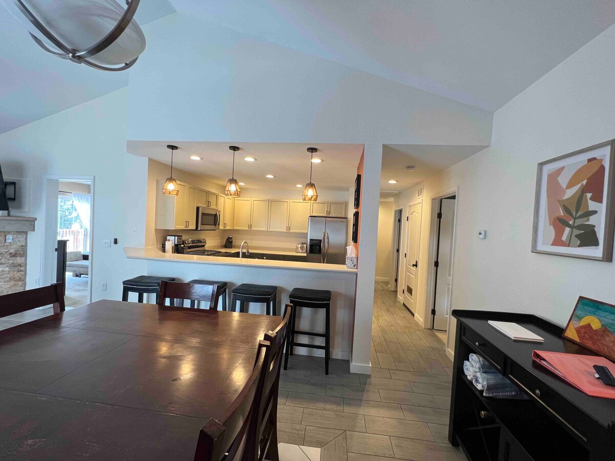 Enjoy the gorgeous views downriver of Gore Creek from the bright main room. This newly renovated modern mountain home has been redone with great care. Cozy up in front of the fireplace, enjoy a game on the 80inch TV or make a home-cooked meal in the fully stocked kitchen! Enjoy a good nights sleep in the new mattress and comfy sheets. Best part, the ptarmigan busstop is a snowballs throw away. 3minutes ride to cascade! New mud room for your skis and boots just added. Vail ID:029206