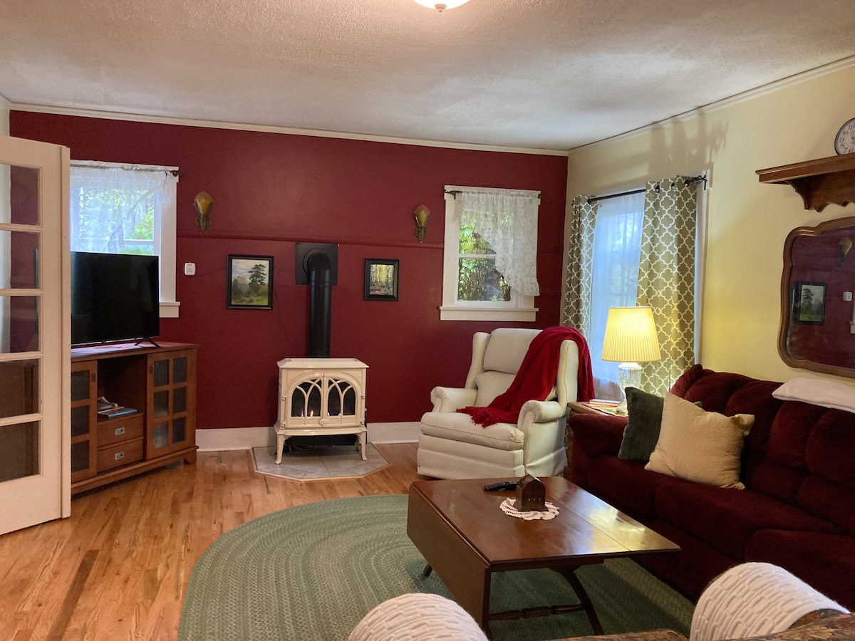 Cette grande chambre de 14 x 20 plus salle de bain est pour les voyageurs non-fumeurs. Fenêtres avec vue sur les bois et entrée privée. Également un matelas Tempur-Pedic queen size, une connexion Wi-Fi, un four à micro-ondes (derrière une porte d'armoire), une bouilloire électrique, un four grille-pain, un Keurig, un réfrigérateur, une plaque chauffante, un évier de bar, une grande télévision (avec plus de 250 chaînes), un lecteur DVD et un stationnement hors de la rue. Rien de haut de gamme ici (sauf le matelas) mais très confortable, propre et privé. La salle de bain dispose également de son propre chauffe-eau à la demande (non partagé).