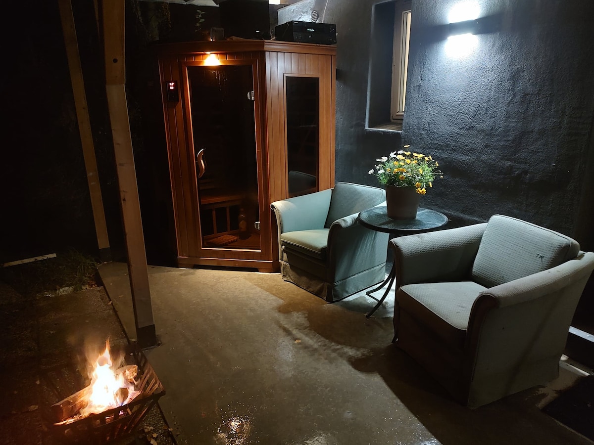 Opplev noe helt spesielt - bo i et sjarmerende og ekte våningshus i tømmer, bygget i 1850! 💦Jacuzzi 🔥Vedfyrt sauna Privat terrasse med koselig sofakrok Gassgrill og bålpanne 🫎Elg og rådyr utenfor døren 🥚Plukk egg til frokost Stue med kjøkken, 1 soverom, bad, entré med ekstrasenger. Sovesofa i stuen. Anneks med 3 senger. Huset ligger landlig til men allikevel kort vei til flyplass (20 min med bil), butikker og shoppingsenter (5-10 min med bil). Fantastisk tur terreng fra gården hele året!