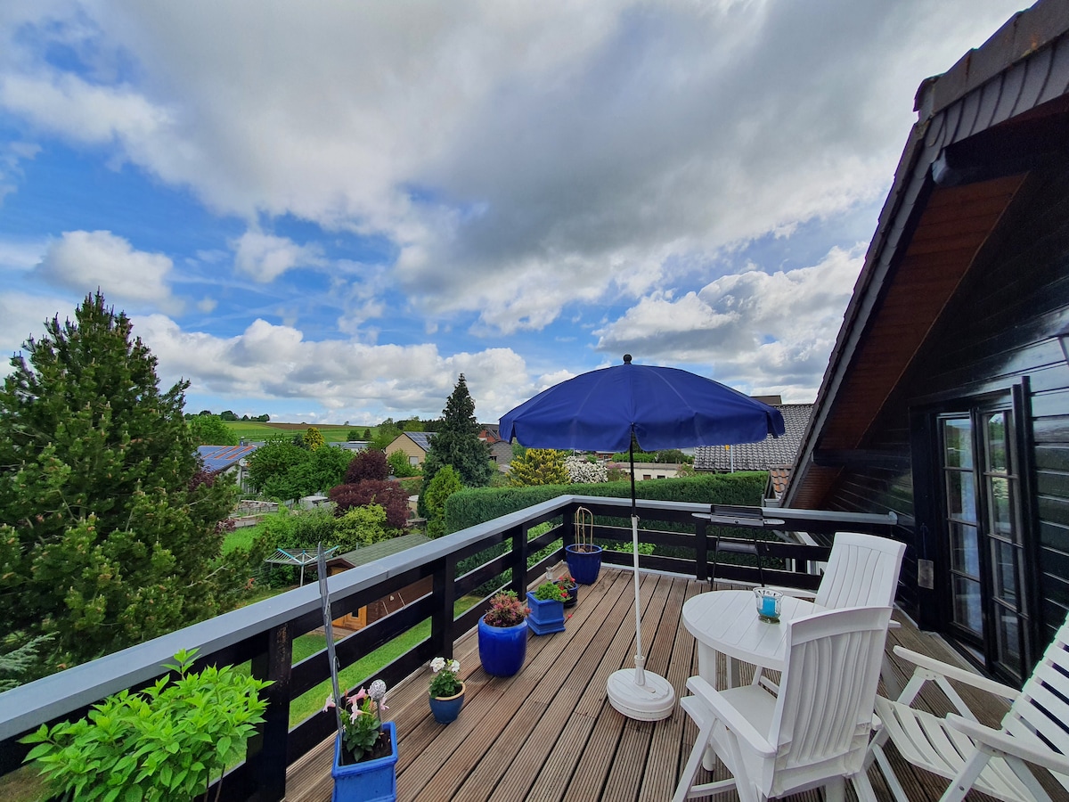 Magnifique appartement mansardé (130 m²) au cœur de l'Eifel volcanique, à Mehren/Daun. Emplacement idéal pour les randonneurs/cyclistes pour découvrir les maars et l'Eifelsteig, une oasis pour se détendre. Le salon-salle à manger spacieux mène au magnifique jardin d'hiver avec cheminée et à la terrasse avec mobilier de jardin confortable. Vue sur le village et la vallée. Cuisine entièrement équipée. Les deux chambres avec lits doubles (160 cm). De la plus grande chambre, accès à la terrasse. Parking directement devant la maison. Les enfants sont les bienvenus.
