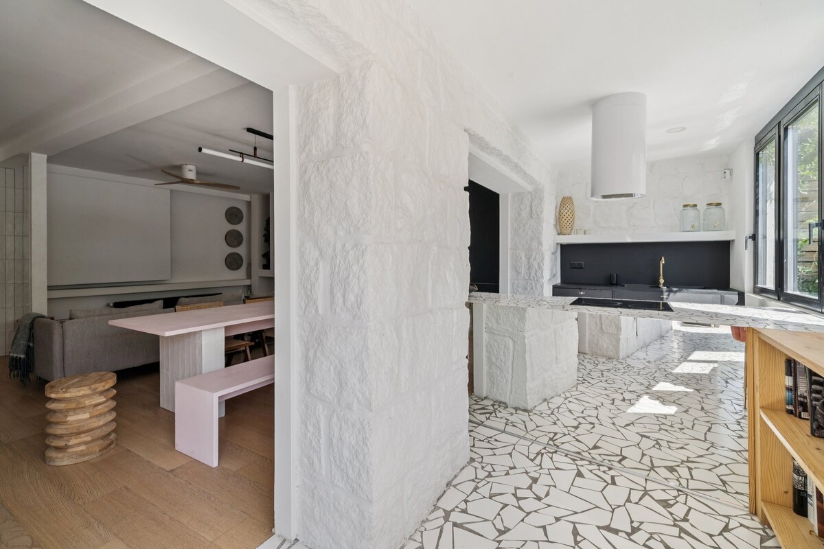 Profitez de la Sierra de Madrid dans notre belle maison en pierre entourée de verdure. Vous vous réveillerez chaque matin avec vue sur un jardin incroyable avec des arbres fruitiers et des fleurs et vous pourrez prendre le petit déjeuner sur une grande terrasse donnant sur la montagne. Des détails tels que l'escalier en colimaçon ou les arches en pierre font de notre maison un endroit spécial et différent. La piscine est super rafraîchissante pendant ces mois et dispose d'un éclairage de nuit afin que vous puissiez profiter d'une baignade à la belle étoile.