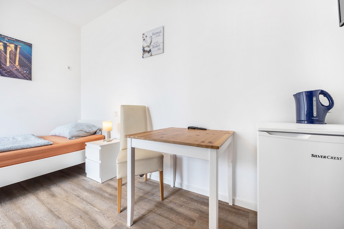 Une escapade en ville ou un long séjour ? Avec tout ce dont vous avez besoin pour vivre, ces studios chics de 22 m² sont élégamment conçus, avec des textures naturelles et des finitions uniques. Vous disposerez d'un lit king size britannique confortable de 150 cm x 200 cm, d'un bureau pour travailler, d'une kitchenette pour cuisiner sans effort et d'une salle de bain moderne. Vous avez du linge ? La buanderie commune est à votre disposition à votre guise. Avertissement : L'appartement sur la photo pourrait ne pas être celui dans lequel vous restez.