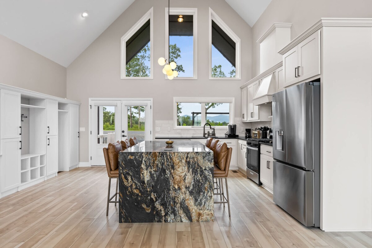 Bienvenue au Serenity Ridge Lodge situé entre Ellijay et Blue Ridge dans les montagnes du nord de la Géorgie ! L'architecture rustique traditionnelle, y compris la construction en poteaux et poutres en bois massif, s'équilibre parfaitement avec le design moderne industriel. Des vues imprenables sur les montagnes, à la fois proches et lointaines, suscitent à la fois un sentiment de paix et de calme. Des meubles sur mesure, des luminaires forgés à la main et une myriade de détails de conception dans toute cette maison design sur mesure offrent aux invités confort et luxe.
