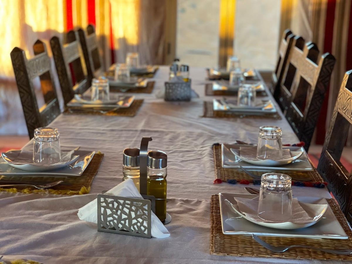 Plongez dans la paix d'une maison spacieuse. Loin du tourisme de masse, cet espace de sérénité vous offre, depuis sa terrasse, le spectacle inoubliable du lever du soleil sur les majestueuses dunes ! Vivez une expérience unique : en autonomie ou avec Hamid, votre hôte expert en bio-tourisme. Organisation des voyages immersifs sur mesure et une immersion complète dans la culture berbère et ses paysages (oasis, villages nomades). Idéal pour voyageurs en quête de paix et de traditions locales.