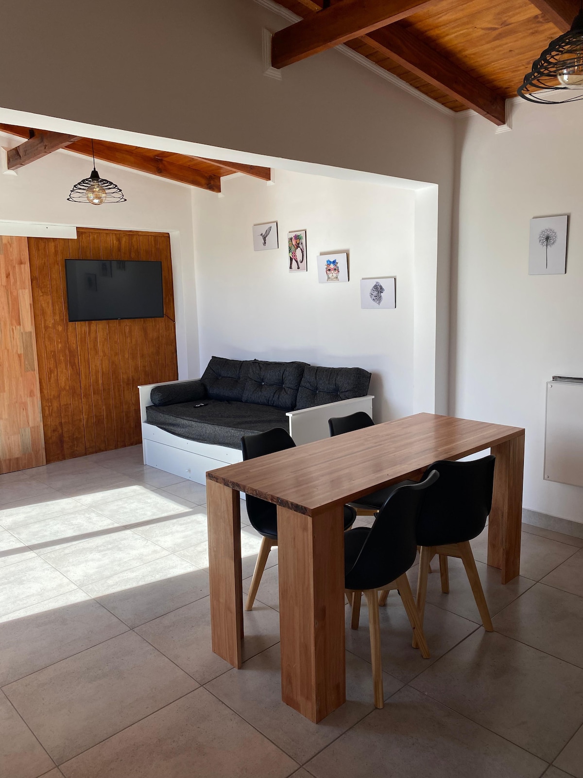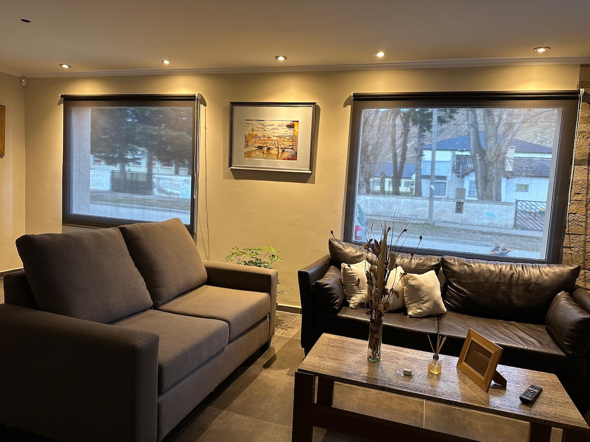 Profitez d'un séjour paisible et confortable dans cet appartement moderne et spacieux à quelques pâtés de maisons du centre-ville d'Esquel. Parfait pour les couples, les familles ou les petits groupes qui cherchent à explorer la beauté naturelle de la Patagonie. L'appartement dispose de hauts plafonds et d'espaces ouverts et lumineux, créant une atmosphère relaxante et aérée. Elle est entièrement équipée pour accueillir jusqu'à quatre personnes, avec un parking privé, une connexion wifi haut débit, DirectTV et un accès à Netflix, HBO et Disney+. Une buanderie extérieure est également disponible pour votre confort.