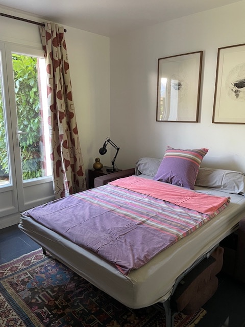 Quartier pavillonnaire, 35m2 environ tout confort. Proche Paris à15mn et gares et tramway. Idéal famille. Salon, cuisine équipée, petite chambre, salle d'eau wc, rangements. Terrasse. Très clair. 1 lit double dans petite chambre et un lit simple et un canapé convertible dans le salon. Petit déjeuner compris. Wifi Arrivée entre 12h et 21 h. Départ entre 7h et 12h.