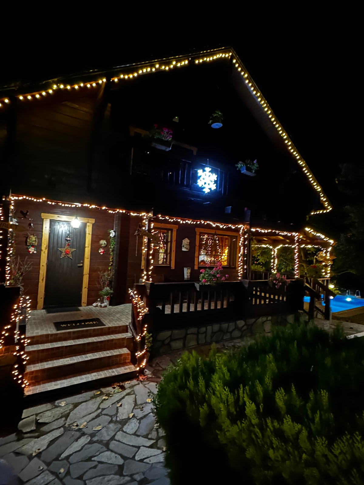 Chalet en bois avec piscine privée près de la mer.