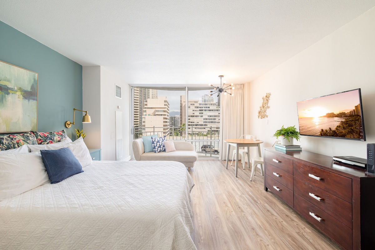 *Aloha! Welcome to the cutest studio in Waikiki!* This is a fully remodeled cute studio with kitchenette in the Hawaiian Monarch. Where everything is walking distance away. Featuring the best Boho style interior design, diamond head and river view, south facing big window, standing desk with monitor and keyboard, 100Mbps wifi speed and projector for 80 inch screen size! NEVER TOO SMALL to have the best stay in Honolulu Update on May 2025, *CHEAP PARKING! And new AC! Parking is $20/day