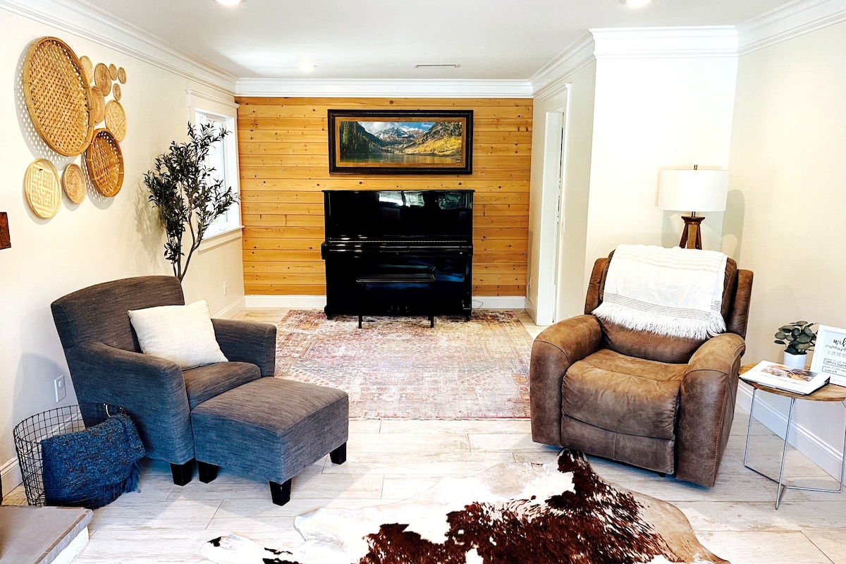 Cette maison fraîchement rénovée dispose de beaux plafonds voûtés et de la lumière du soleil qui brille. Vous adorerez passer du temps avec votre famille dans la cuisine gastronomique ouverte, une partie de la Grande Chambre qui comprend la salle à manger et le salon avec une grande télévision et une cheminée. Salle de jeux et jacuzzi privé ! L'hôte réside dans un bâtiment séparé à environ un quart d'acre. Il est rarement là et vous aurez une intimité totale. Vous avez accès à tous les équipements sans aucun partage avec Cory ou toute autre personne.