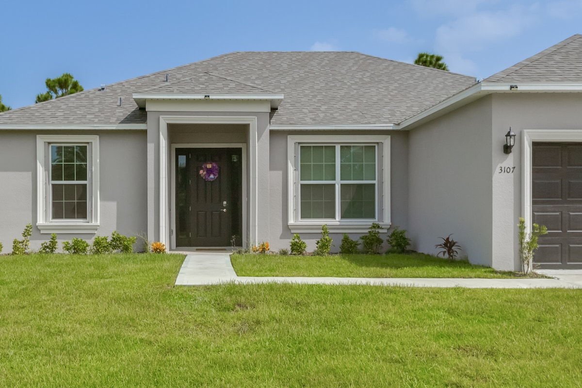 Détendez-vous avec toute la famille dans ce lieu de séjour paisible. 15 minutes de la plage, 5 minutes du bord de la rivière. À une heure de Disney et de l'aéroport d'Orlando. Magnifique et unique. Deux grandes chambres et deux salles de bains. Une chambre fermée en Floride avec climatisation et un lit de jour. Peut accueillir confortablement 5 personnes. Cuisine avec comptoirs en quartz et appareils de qualité professionnelle. 4 tabourets de bar autour de l'îlot. Salle à manger ouverte avec 4 places assises. Garage à deux places avec lave-linge et sèche-linge.