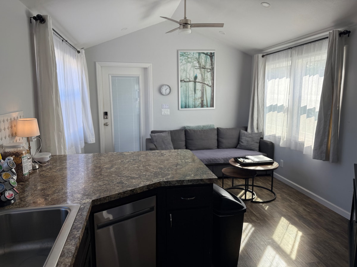 Tiny Home with full kitchen on a peaceful 13 acres in a small town. Owner lives on site, but the tiny home is away from the main house so it is private. Ideal for 2 guests, but there is a pull-out sofa which could be comfortable for one more adult or a couple kids. Room for more than one car or a trailer. (Not suitable for 4-legged travelers due to free ranging ducks, peacocks and close proximity to horses and miniature donkeys) (If your dates are unavailable, search Mira Bella South)