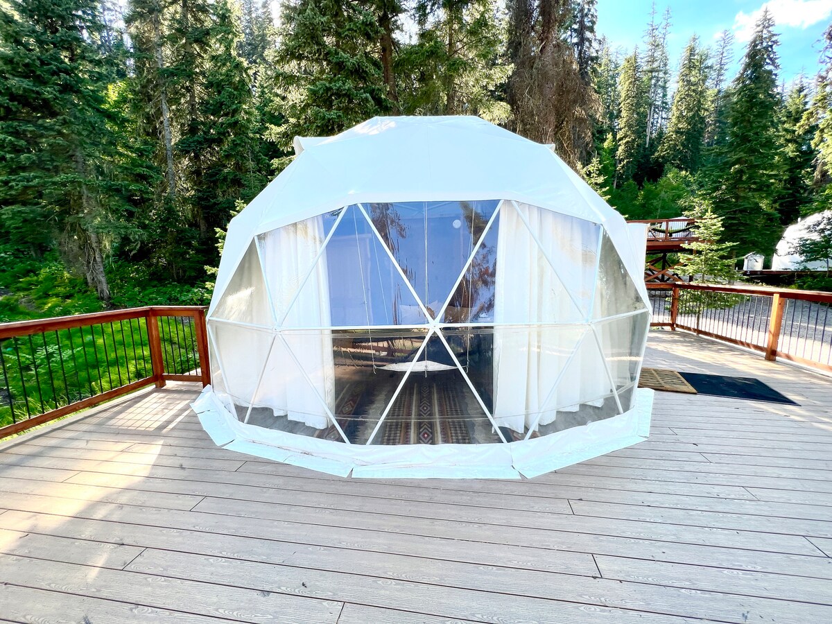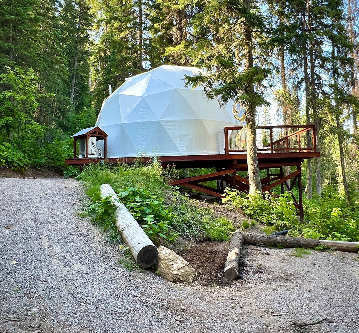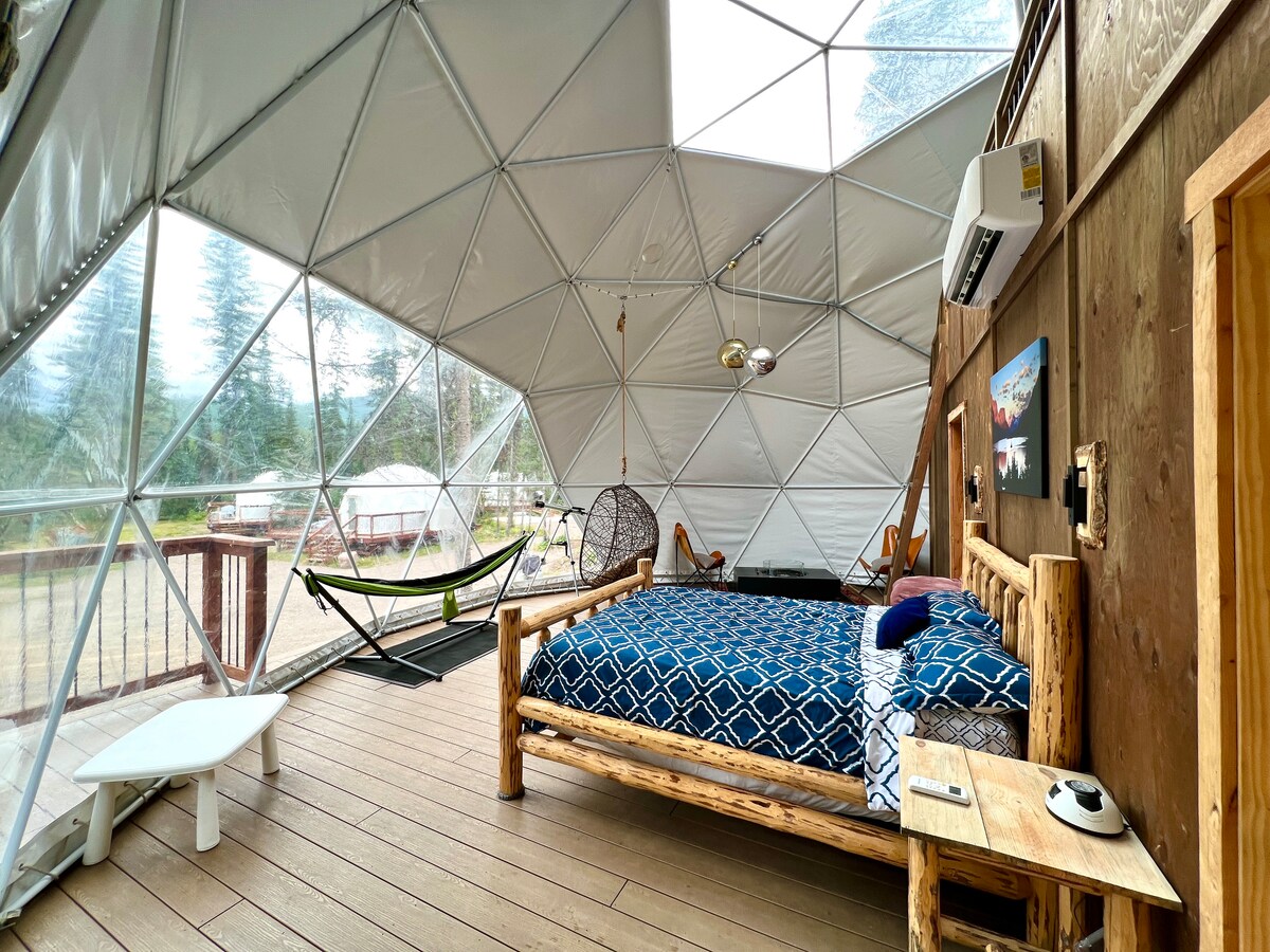 Bienvenue à Red Owl Retreat : The Peaks Geodesic Dome. Nichée au cœur des bois reculés près du lac Flathead, cette retraite rustique offre confort et nature. Parfait pour les couples, il dispose d'un lit queen size, d'une kitchenette, d'une salle de bains privée et d'une vue imprenable sur la forêt et la montagne. Profitez de la terrasse, du brasero communautaire et du barbecue, et du wifi Starlink. Explorez la randonnée, la pêche et l'observation des étoiles. Parfait pour les aventuriers en plein air passionnés ! En raison de l'emplacement éloigné, préparez-vous à rencontrer des animaux sauvages, des insectes et un ciel sombre.