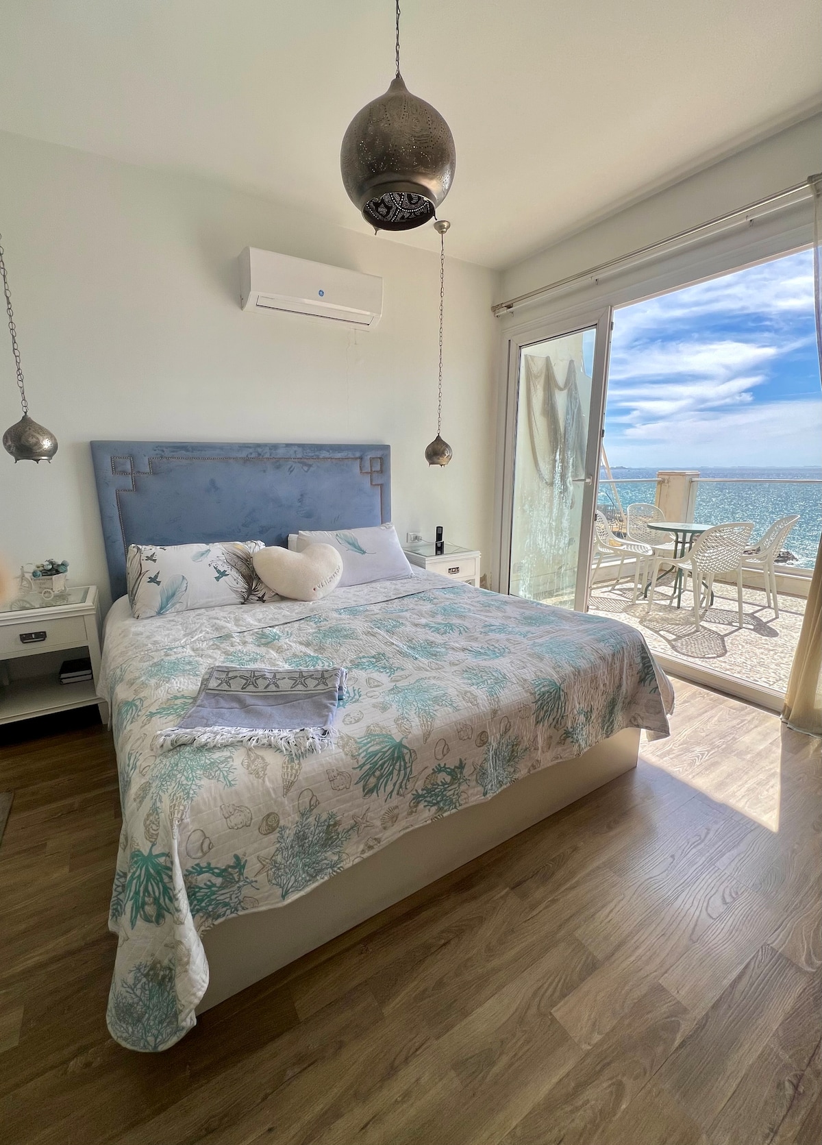 Réveillez-vous avec la vue et la brise fraîche de la Méditerranée. Cet appartement côtier luxueux et unique avec son style bohème chic décontracté est entièrement axé sur le confort. Profitez de la vue majestueuse sur la mer et les jardins royaux de Montaza. Notre logement spacieux et unique dispose de tous les équipements que vous recherchez, les restaurants et cafés sont accessibles à pied et l'accès à la plage est abordable. Nous vous offrons notre logement privé pour en profiter pendant le temps où nous sommes obligés de le quitter, en espérant que vous l'aimerez autant que nous.