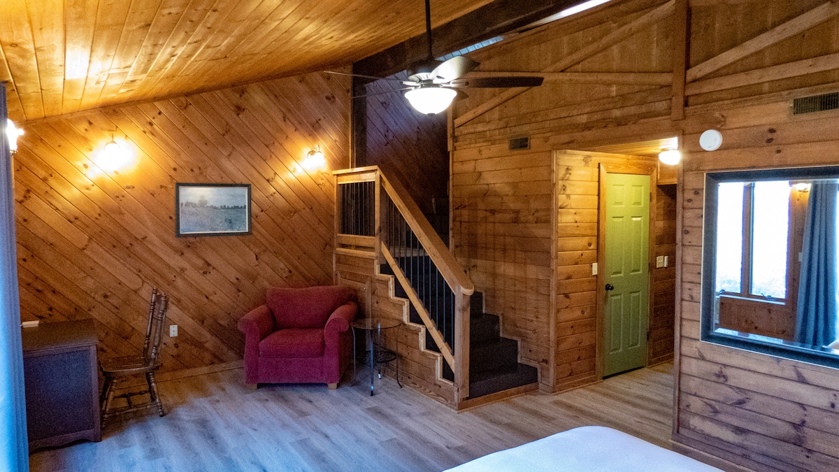 Un endroit vraiment magique ! Expérience unique dans une cabane rustique mais élégante surplombant la rivière, les bois, les prairies et la faune ! Maison privée confortable mais spacieuse sur 12 acres ! Escapade romantique de luxe avec nouveau jacuzzi à double inclinable sous les étoiles, baignoire sur pieds, suite parentale royale ! Puits de lumière, poutres/planchers en bois, poêle à bois, mini-split et climatisation. Café et thé bio et cuisine gastronomique fournis ! Massages et plus disponibles !