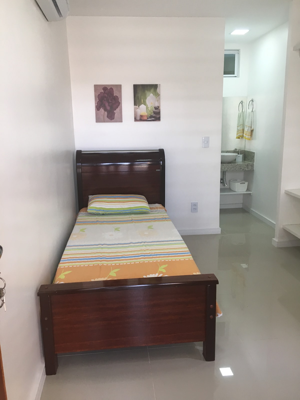Suite avec lit simple, minibar, climatisation, bureau, armoire et salle de bain complète. Cuisine (micro-ondes, mixeur, sandwicherie, cuisinière et accessoires divers) et buanderie (machine à laver) partagée avec l'autre suite. Espace indépendant de la maison de l'hôtesse. Obs¹ : Climatisation avec une franchise de 138 kWh (moyenne de 8 h/jour). Au-delà de cette valeur, un supplément de 1,00 R$/kWh sera facturé. Remarque² : Les arrivées effectuées entre 0 h et 5 h du matin seront facturées 30 R$.