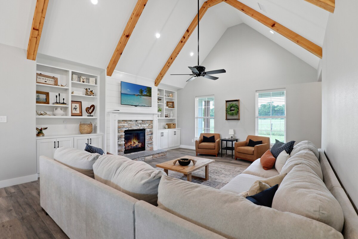 Profitez d'un séjour paisible dans une ferme moderne spacieuse à quelques minutes du lac Richland Chambers. Avec quatre chambres, 5 salles de bain et demie, deux espaces de vie, une cuisine avec des appareils de luxe (y compris une cuisinière à gaz) et une salle de jeux bien approvisionnée, ce logement peut accueillir tous les âges. Sortez et détendez-vous sur 55 acres, avec un étang de pêche et de nombreux équipements adaptés aux enfants, y compris un paysage de jeu, un trampoline et une balançoire en corde. C'est l'endroit idéal pour vous évader de la vie urbaine et vous détendre.