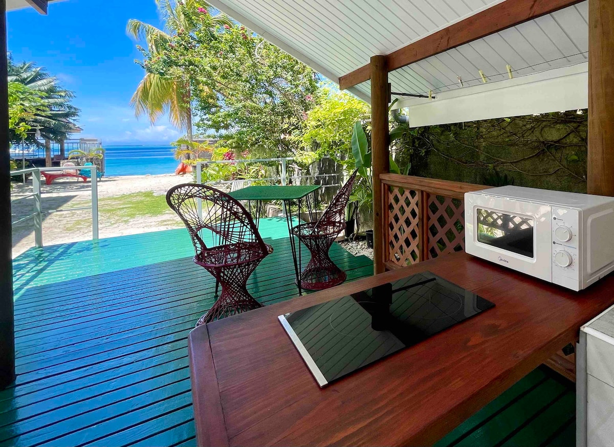Bungalow duplex indépendant, bord de mer, situé dans une propriété privée. 1 chambre climatisée avec 1 grand lit 2 places + 1 canapé-lit. Un espace cuisine et salle de bain. Terrasse privative exterieure dans jardin bord de l'eau. 2 kayaks à disposition pour accéder au banc de sable à 100 mètres du faré et au spot de surf de Taapuna, à 800 m. Aéroport international /inter-îles à 10 minutes en voiture. Supermarché ouvert 24h/24 à 10 minutes à pieds. Restaurants, snack et roulottes à proximité.