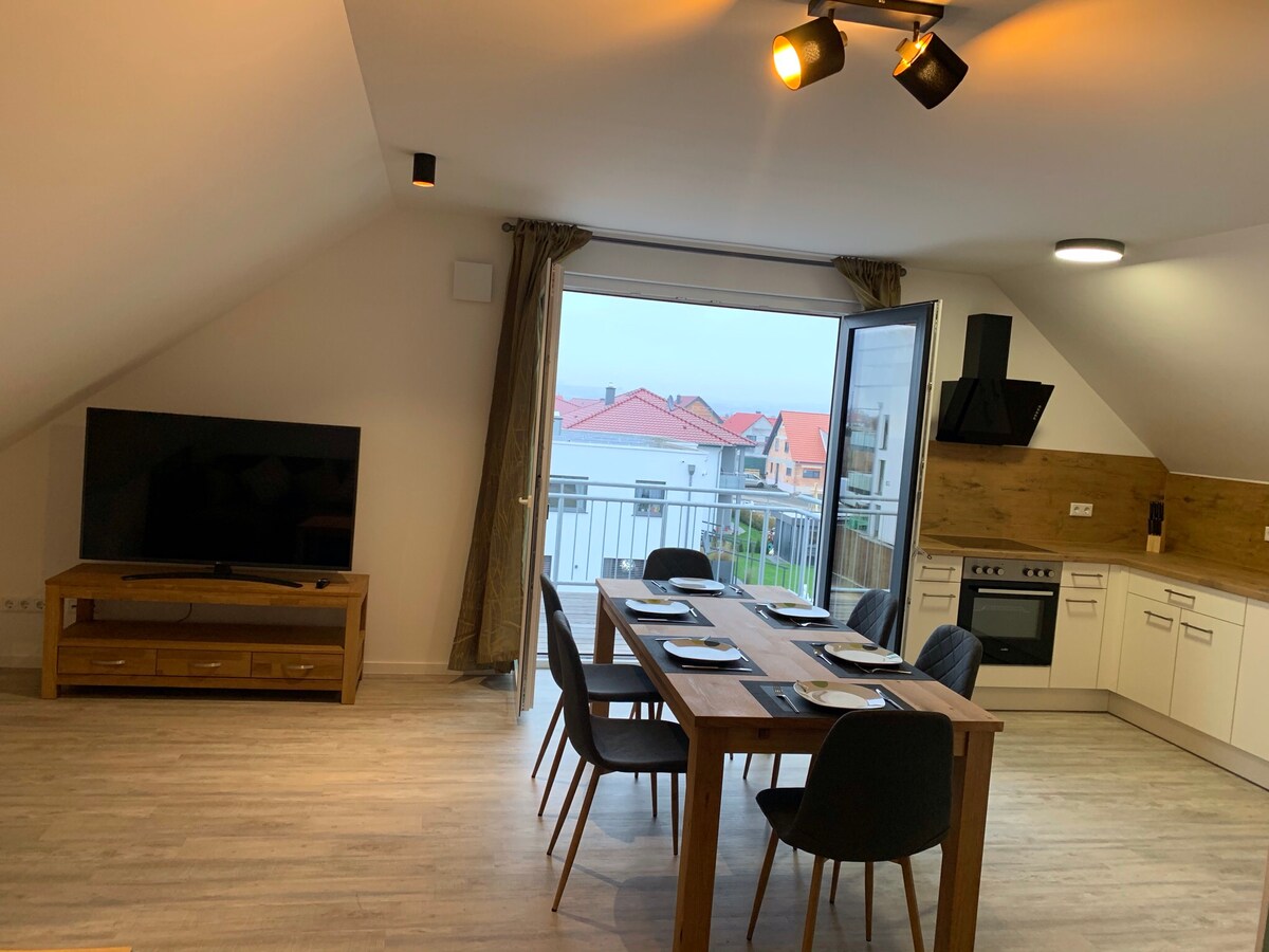 Ce logement paisible offre un séjour détente pour toute la famille. Nous proposons un appartement 2 pièces spacieux et meublé au premier étage. Grand salon avec coin couchage/salon, cuisine-salle à manger entièrement équipée, 2 chambres (chambre 1 avec lit double, chambre 2 avec deux lits simples, salon avec canapé-lit), salle de bain avec WC et douche. Vous avez tout l'appartement pour vous et ne le partagez qu'avec vos compagnons de voyage.