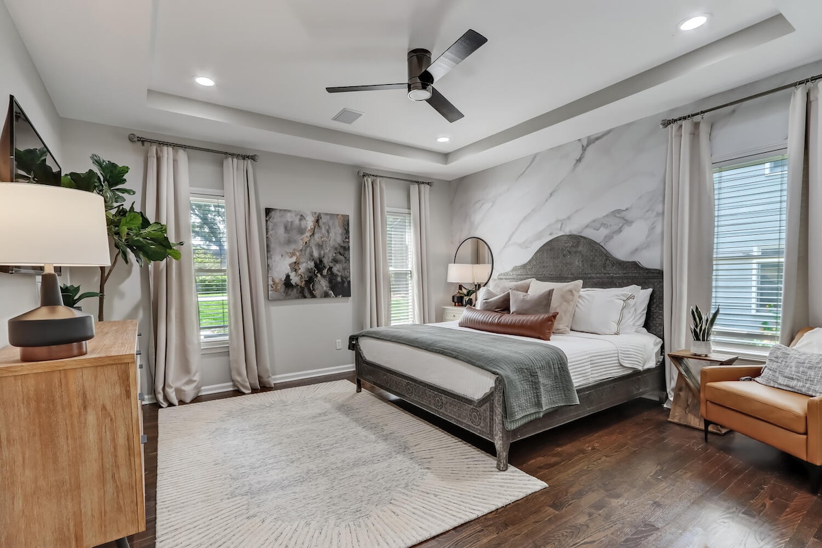 Profitez d'une expérience élégante dans cet appartement situé au centre, à un mile de Marietta Square, à un demi-mile de l'hôpital Kennestone et de l'I-75. Accès aux sentiers de montagne de Kennesaw et à Mountain to River Trail depuis le quartier. Animaux bienvenus. Grill, foyer, sauna, vélos et jacuzzi disponibles sur réservation. Une chambre avec lit King size, mais lits superposés avec lit gigogne dans le salon, pouvant accueillir confortablement cinq personnes.