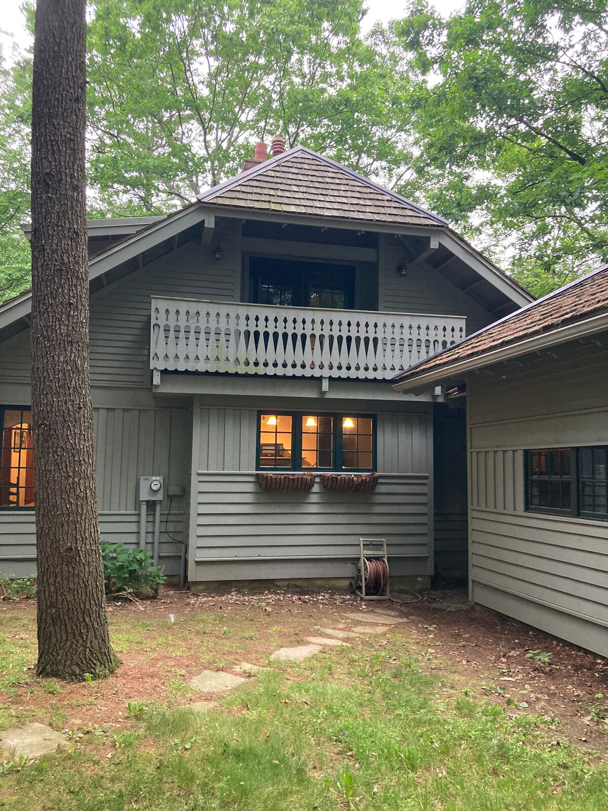 Cette belle maison a été construite pour la tranquillité. Le mur de fenêtres donnant sur les bois, les balcons s'ouvrant de chaque chambre, le porche latéral protégé, tout cela permet de profiter facilement du cadre naturel et calme en toute saison. REMARQUE : pour des raisons de sécurité, nous recommandons vivement de réserver des expériences réservées aux adultes ou aux enfants de 14 ans et plus. Les marches sont en bois dur. L'arrière de la maison repose à côté d'un ravin.