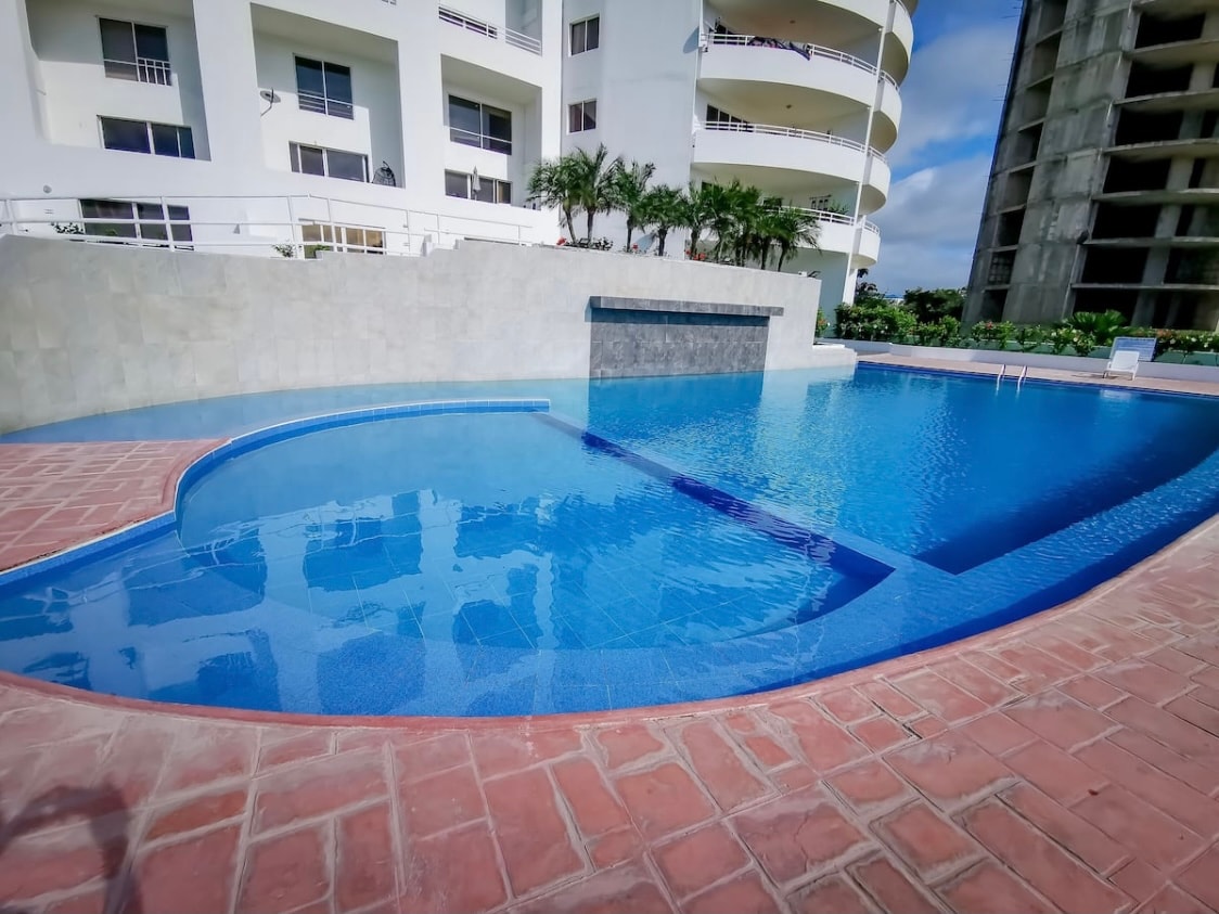 Appartement indépendant, 1 chambre principale (Op1 – 1 lit, Opc2 – 2 lits) avec salle de bain dans la chambre, 1 chambre (1 lit), 1 chambre et salle de bain sociale, réfrigérateur, équipements et accessoires de cuisine, climatisation, ventilateurs sur pied dans les chambres, télévision 32" avec DIRECTV prépayé, piscine dans le bâtiment, terrasse dans la chambre principale, grande terrasse dans le salon/salle à manger.