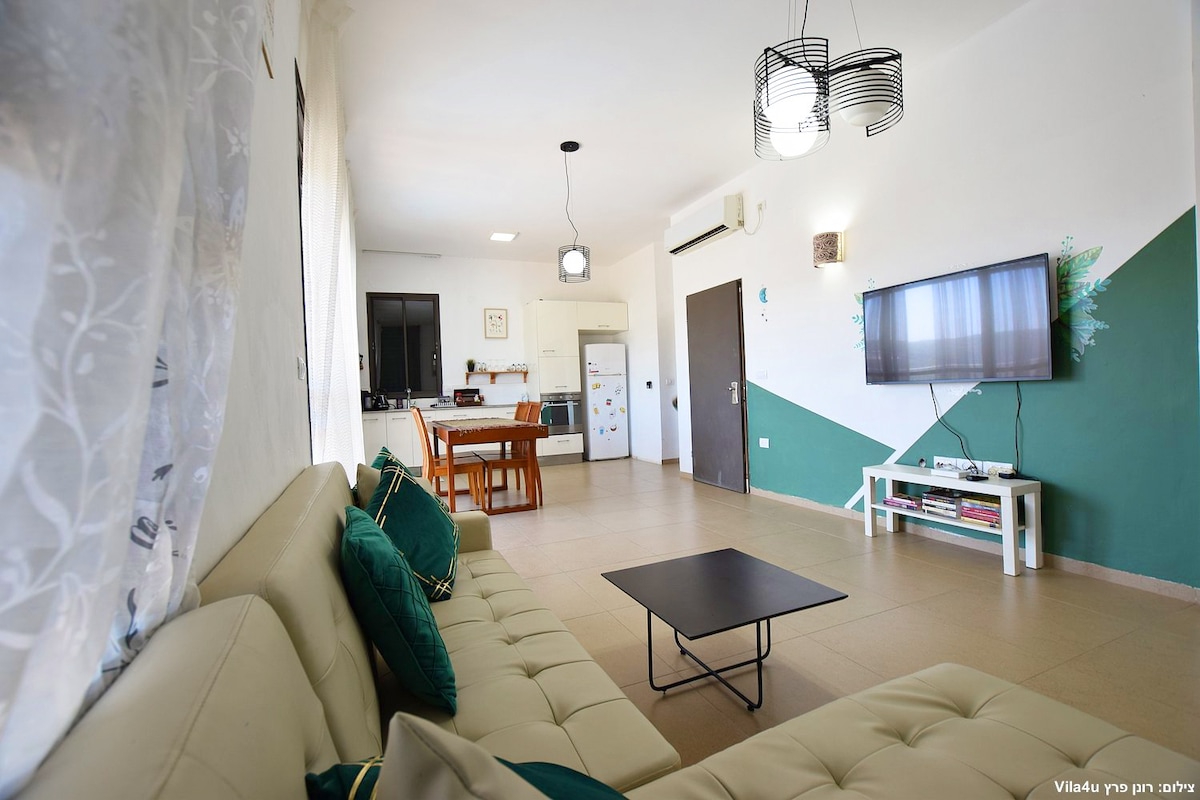 Une unité d'hôtes dans le quartier religieux de Moshav Keshet, sur les hauteurs du Golan. Nouveau logement spacieux pour les voyageurs. Entrée indépendante. 2 chambres plus salon. D'immenses balcons avec une vue imprenable sur l'Hermon et la mer de Galilée. Une cuisine équipée - réfrigérateur. Électrique. Micro-ondes et plus. Convient aux grandes familles pour un couple plus 7 enfants. L'appartement est équipé pour le Shabbat et comprend une plaque de cuisson. Chauffe-eau électrique. Horloges Shabbat. Synagogue active. Il est important pour nous de noter que la porte d'entrée du siège se ferme à l'entrée du sabbat et s'ouvre à la sortie, vous pouvez vous garer à l'entrée du siège et nous rejoindre à pied, à 3-4 minutes à pied,nous sommes situés très près de l'entrée.