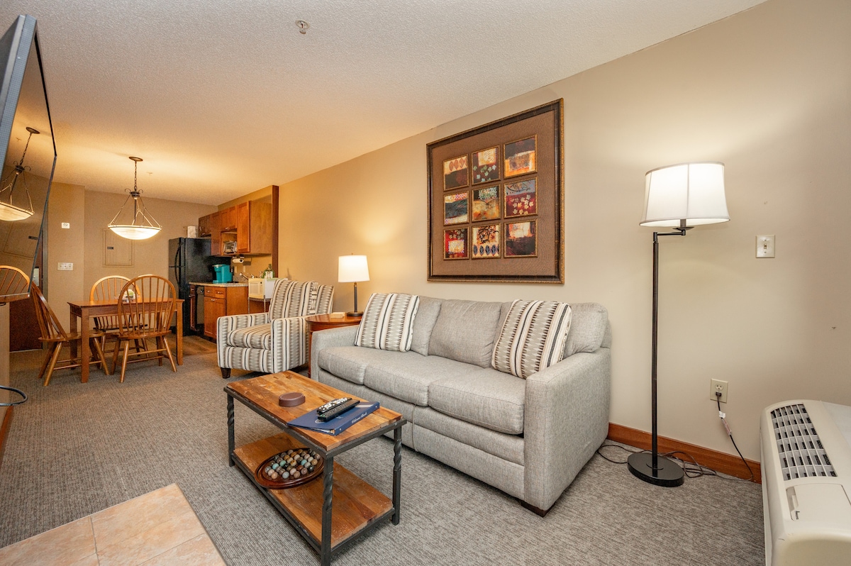 Studio loft, appartement d'une salle de bain avec patio privé, cuisine complète et cheminée électrique. (Accès ascenseur inclus) Équipements de l'hôtel disponibles pour tous les clients : piscine intérieure et jacuzzi à deux niveaux, deux restaurants sur place, 240' de front de mer et de quais de sable, centre de remise en forme, salle de jeux, terrain de racquetball, parking couvert, WIFI gratuit et une vue sur le lac avec chaque chambre !