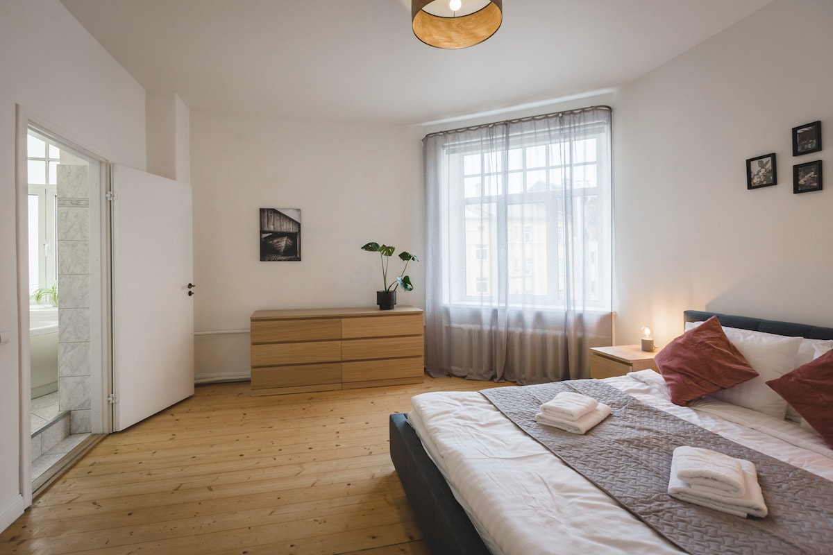 Bienvenue dans notre appartement spacieux et ensoleillé de 100 m² en plein centre animé de Riga ! Cet endroit confortable est parfait pour les familles ou les groupes d'amis qui veulent un mélange de plaisir en ville et un endroit calme pour se détendre. Nous pouvons accueillir jusqu'à cinq personnes en même temps. Le plus grand trésor de cet appartement est une grande terrasse et un parking gratuit qui n'est pas si facile à trouver ailleurs dans le centre-ville ! Notre appartement est confortable, pratique et constitue une excellente base pour votre aventure en ville. Nous avons hâte de vous rencontrer !