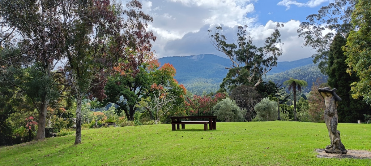 Gorgeous, character-filled cottage with open fireplace. Stunning mountain views and gardens. Walk to Warburton Rail Trail, Yarra River, and Launching Place Hotel. Close to cafes, wineries, Healesville Sanctuary, Mt Donna Buang, and all the Yarra Valley offers. We live in a separate dwelling on-site—here to assist if needed but won’t interrupt your relaxing stay. Chat with our friendly dogs, sheep, duck, and chooks Please note -catastrophic fire rating days your booking may need to be cancelled