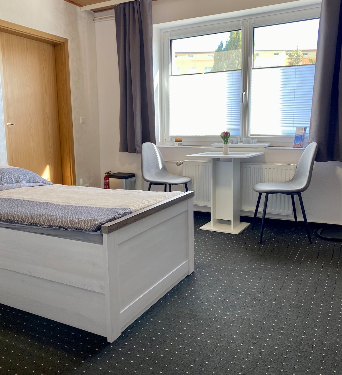Bienvenue ! Un petit studio moderne vous attend au premier étage d'une maison à deux familles. La cuisine est équipée de tout le nécessaire : Machine à café à capsules, bouilloire, micro-ondes, plaque vitrocéramique, réfrigérateur. La vue donne sur notre beau jardin, les vélos peuvent y être garés. La voiture peut être garée juste en face de la maison. En 10 minutes, on est à vélo dans le beau centre-ville ou en 15 minutes au lac le plus proche. Pas d'emplacement central !