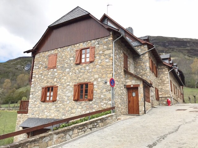 Appartement Duplex (Dreta) WIFI gratuit. Deux chambres (5 pax maximum), salle de bain complète, salon avec kitchenette entièrement équipée. Draps, couettes et serviettes fournis. VUES SPECTACULAIRES. Tous les appartements dans lesquels la maison est divisée, ont un accès libre à la Terrasse-Mirador privée du logement. Garez-vous devant la maison. À 3 km de Vielha et à 15 km de Baqueira. Nous avons deux appartements très similaires (Dreta i Esquerra), entre les deux ils peuvent accueillir 10 personnes.