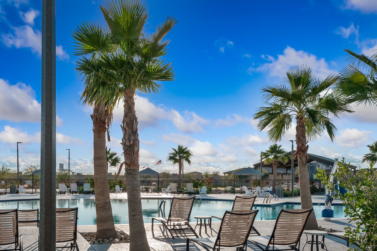 Bienvenue dans la maison artisanale dans le désert. Il y a un grand espace extérieur avec une piscine chauffée, un barbecue et une table de feu au propane. Le chauffage de la piscine est inclus dans le coût de votre séjour d'octobre à mai. Vous apprécierez de recevoir dans la cuisine de chef entièrement équipée avec des appareils électroménagers mis à jour et une friteuse à air dans le four. Les lits confortables sont en mousse à mémoire de forme et les salles de bains sont toutes deux rénovées. Évitez la circulation des jours de match/concert et optez pour une promenade facile. Nous sommes situés à 0,8 miles du State Farm Stadium.