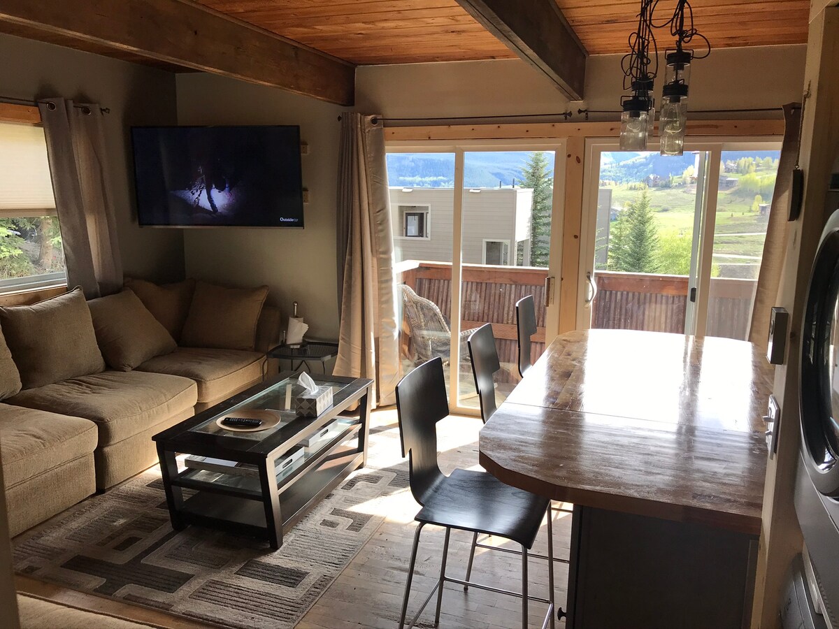 Ce logement d'angle de deux étages, deux chambres et deux salles de bain peut accueillir jusqu'à 6 personnes et ressemble plus à une maison qu'à une maison de ville ou à un condo. L'espace privé offre une belle vue orientée vers l'ouest sur la ville de Crested Butte en contrebas, Oh Be Joyful Range, Mount Emmons et Red Lady Bowl. D'immenses baies vitrées, une terrasse ensoleillée avec des chaises de ski Adirondack faites maison en été et en automne, une pelouse privée et un foyer au gaz confortable : l'endroit idéal pour l'après-ski avec les amis et la famille. Les couchers de soleil sont spectaculaires.
