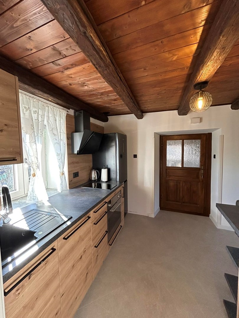 La maison était principalement destinée à la famille et à l'accueil d'amis autour de la cheminée, de la bonne nourriture, du vin et du feu. C'est pourquoi il y a une grande table et des bancs. Nous l'avons décorée à notre goût, tous les meubles sont en bois. Lors de la décoration, nous ne nous sommes pas laissés guider par le fait que tout devait être harmonisé et assorti, mais plutôt par le fait que cela devait être beau, confortable et fonctionnel. Comme nous avons eu l'idée de la louer, nous espérons que tous les invités qui s'y trouveront seront tout aussi beaux et confortables.