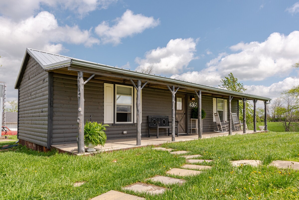 Découvrez le charme de notre cabane conteneur rustique sur une crête boisée de notre ferme familiale. Extérieur fraîchement peint, intérieur confortable. À 30 minutes d'Ark Encounter. Détendez-vous sur le porche au coucher du soleil sous des guirlandes lumineuses, profitez du foyer et du barbecue, et respirez l'air frais du Kentucky en explorant 200 acres de collines et de sentiers. Intérieur : touches de ferme vintage, lit(s) confortable(s) en mousse à mémoire de forme, kitchenette efficace, chauffage/climatisation et salle de bain unique. Une base paisible pour l'Ark et le Boutbon Trail. Un véritable séjour à la ferme dans le Kentucky.