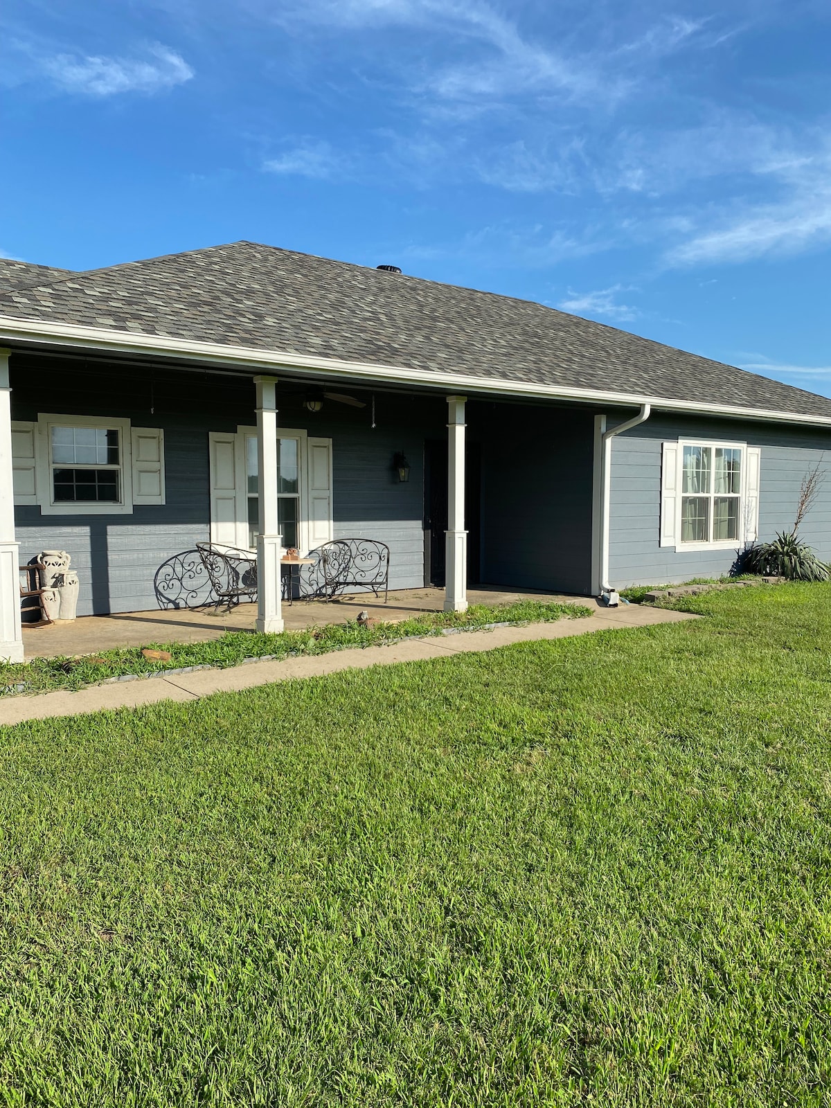 Grande maison de 5 chambres et 4 salles de bain située sur un ranch de 31 acres avec 2 granges et un étang. Emplacement idéal pour les mariages, remises de diplômes, fêtes, anniversaires et autres événements. La cour arrière est équipée d'un éclairage qui permet des réceptions en soirée. Grand parking pour les voyageurs. Nous avons accueilli des événements avec plus de 200 invités et plus de 50 véhicules avec service de voiturier en option. Garage pour 3 voitures et salle de jeux. À 20 miles du lac Texoma, à 15 miles du refuge faunique Hagerman. Des frais d'événement s'appliquent pour les événements avec visiteurs.