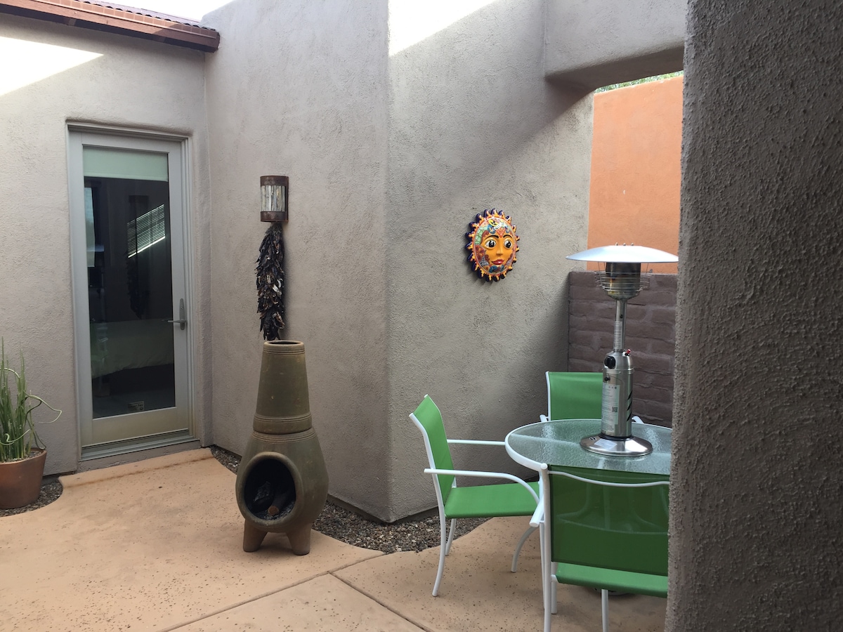 The casita is located between the Golf Course and Tubac village. The casita has a private bedroom and bathroom with outside entrance. The private yard has a covered porch and outdoor kitchen. Inside is a king-size bed, table, chairs, refrigerator, microwave, coffee pot. Amenities include WIFI, local TV, Peacock. Weekly and long stay discounts. Early checkin/late checkout usually available... Please ignore the 13 photos at end. They are for my small house listing in case you are interested.