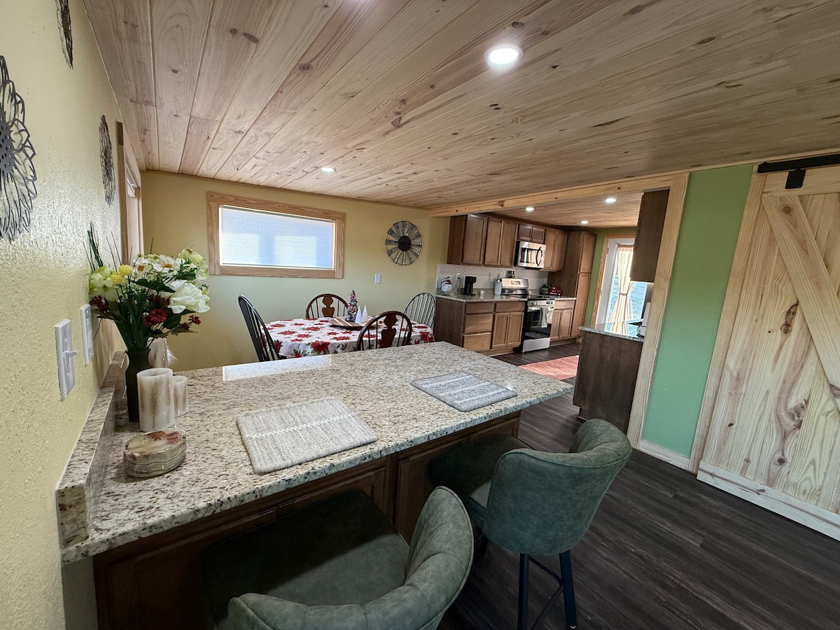 Évadez-vous sous les étoiles dans ce chalet de campagne unique. Asseyez-vous sur l'un des 3 porches et profitez des levers et des couchers de soleil au-dessus de la cime des arbres tout en écoutant la sérénade des oiseaux. Quittez la vie urbaine bruyante et les horaires quotidiens trépidants pour vous évader dans ce chalet confortable à la campagne.
